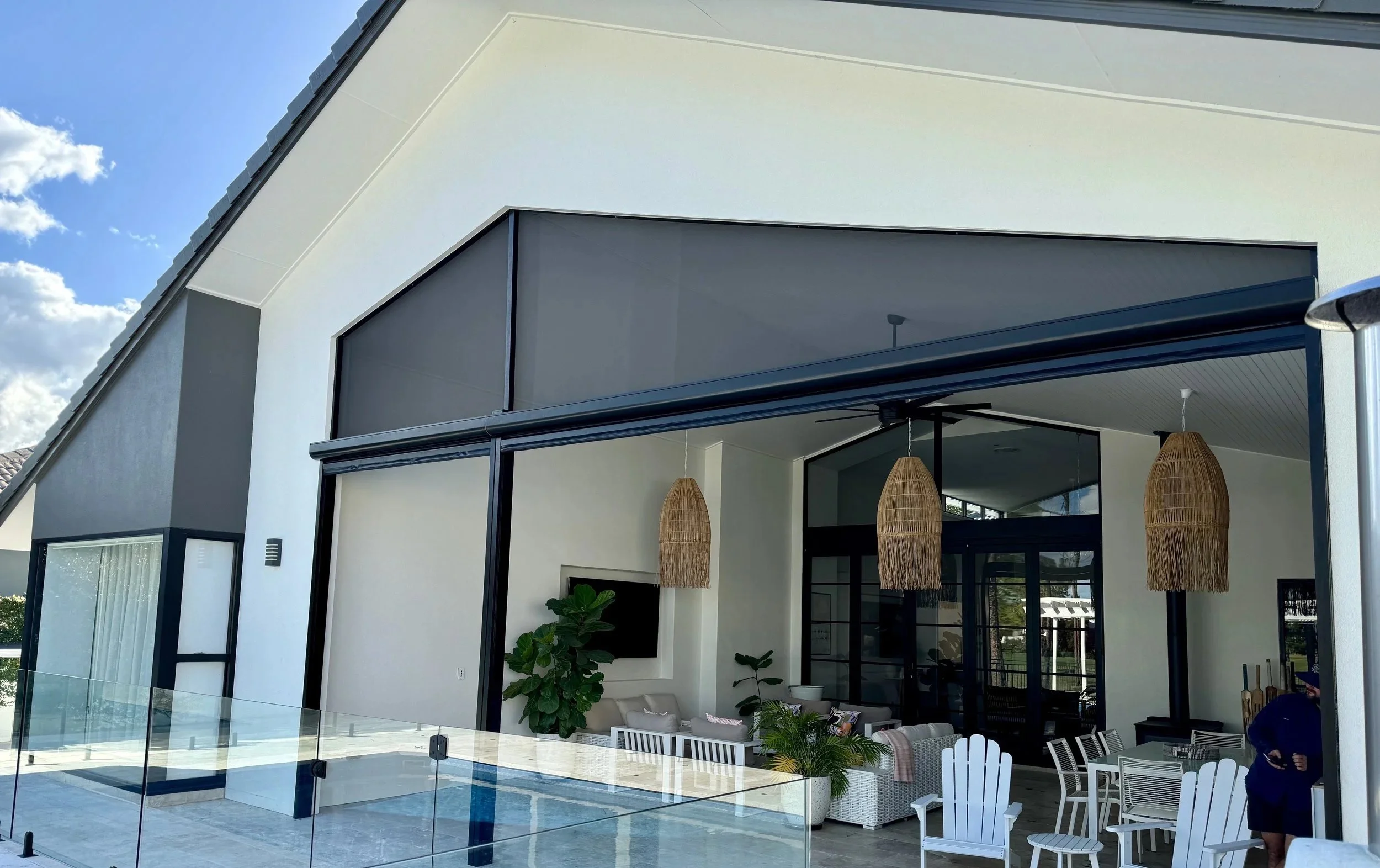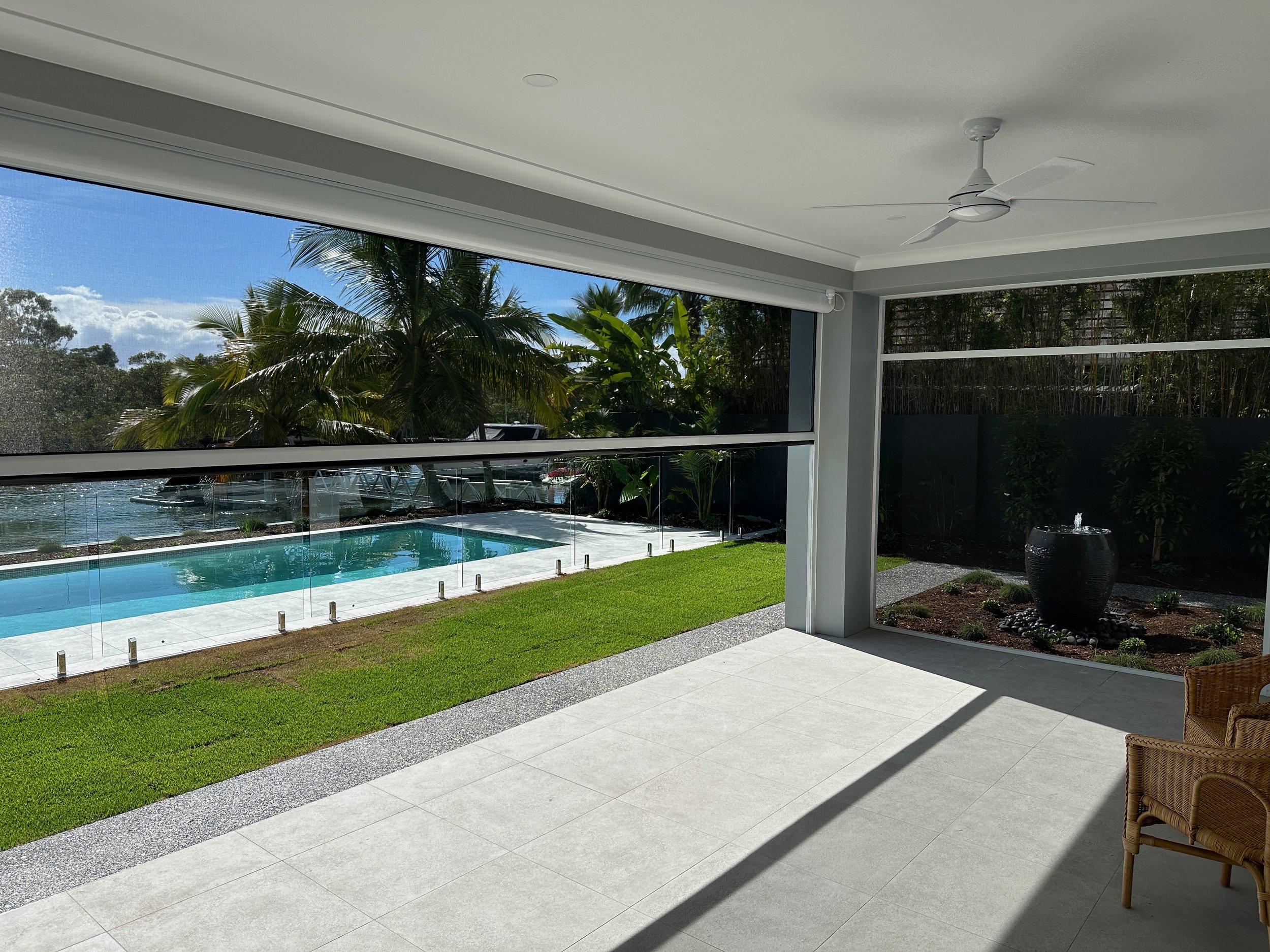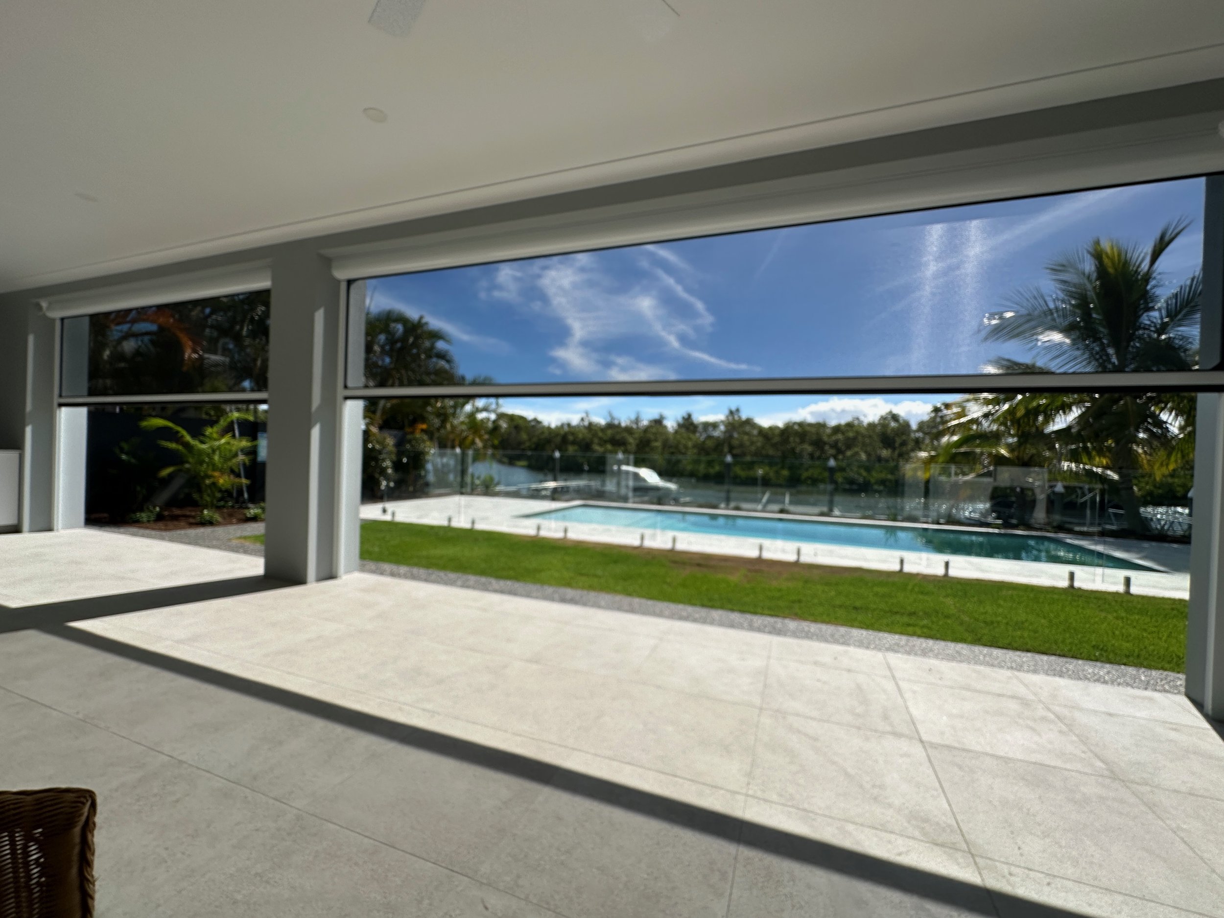 This stunning waterfront property showcases what's possible when automated screen blinds are designed to disappear. Spanning a wide alfresco entertaining area and elevated balcony, the slim-profile blind system retracts completely into flush ceiling-mounted housing — leaving nothing between the homeowner and their resort-style pool, tropical gardens, and sweeping canal and marina views beyond. Whether fully open or closed for protection, every position looks intentional. This is outdoor living without compromise.