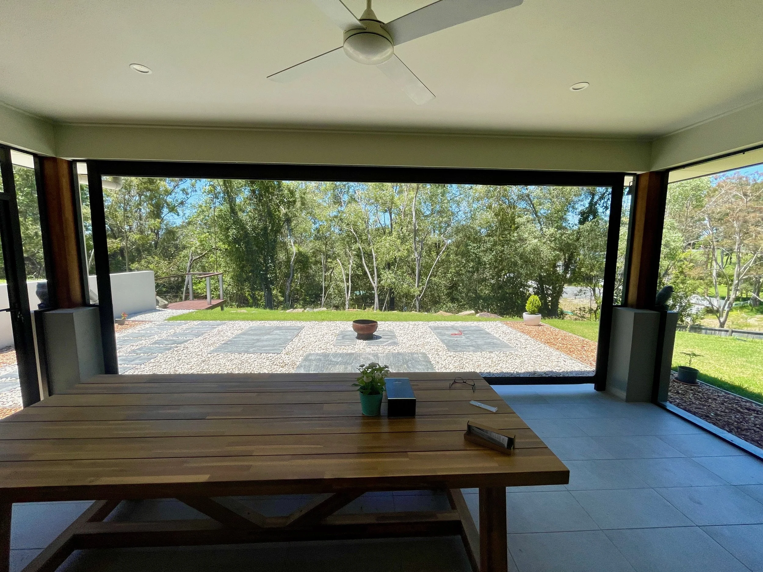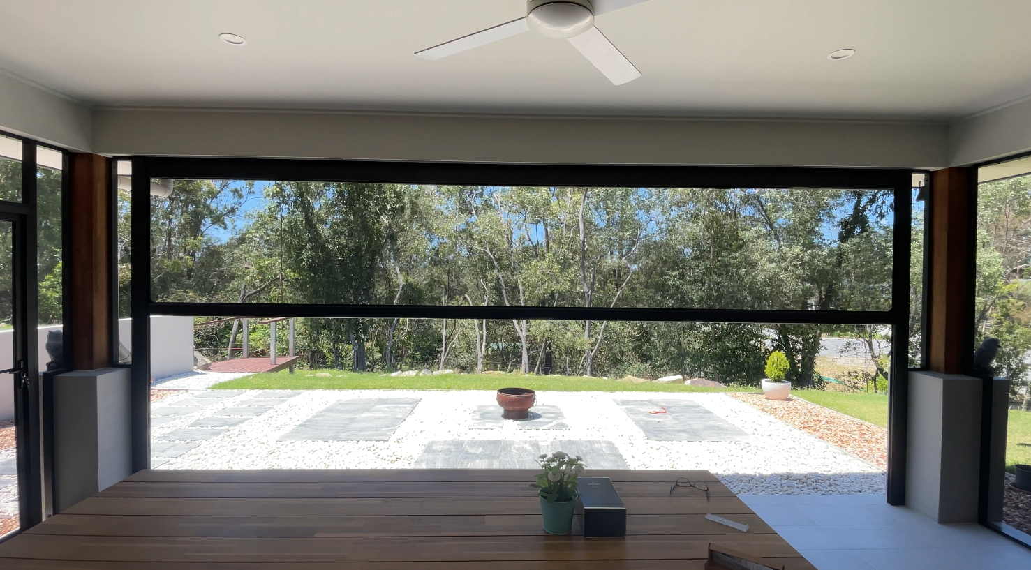 Covered outdoor alfresco area with automated screen blinds fully retracted, revealing an open view of a landscaped garden and native bushland, with a timber dining table in the foreground.