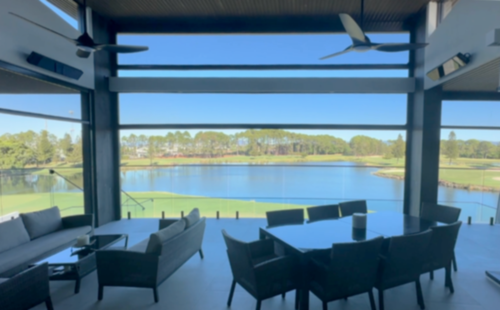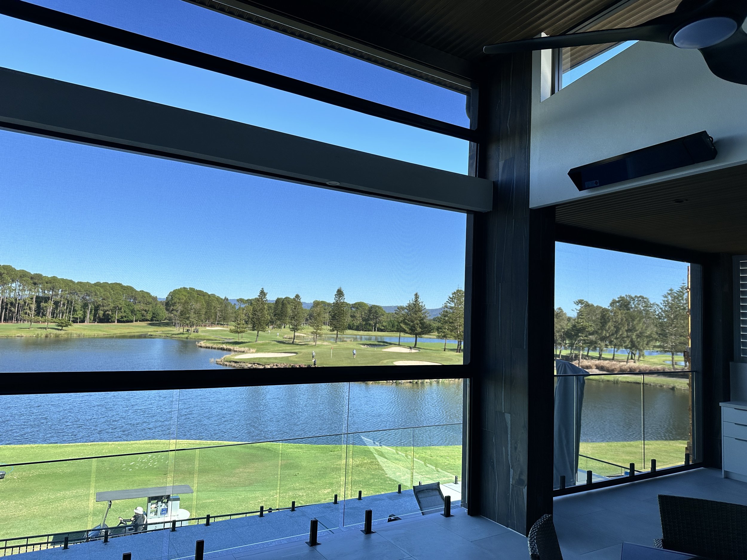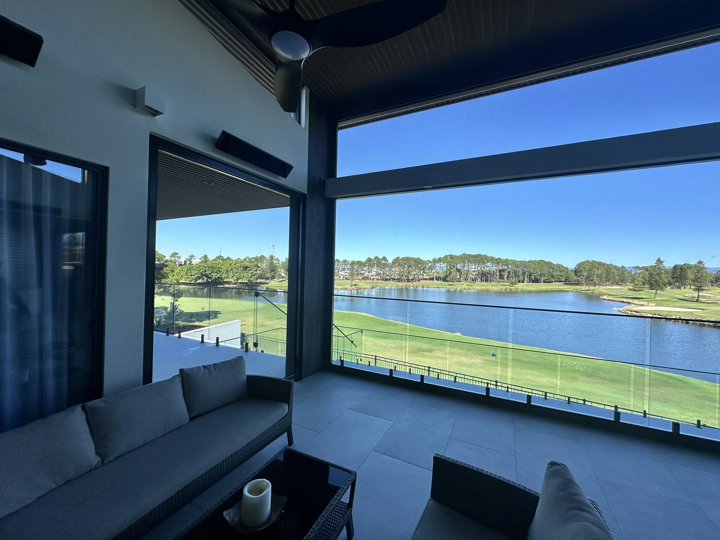 Automated screen blinds fully retract to reveal an uninterrupted panoramic view across a championship golf course and lake. Notice the smaller upper blind panel, also fully retracted into its own separate housing above the main blind. With the main blinds both 7.2m wide every centimetre of that view is protected when you need it, and completely unobstructed when you don't.